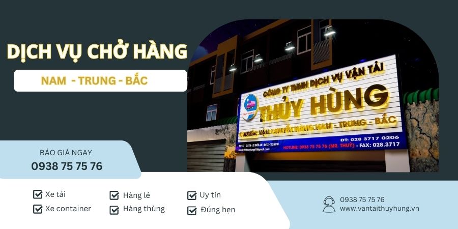 VẬN TẢI THỦY HÙNG là một trong những đơn vị hàng đầu cung cấp dịch vụ vận chuyển hàng hóa nổi bật với tiêu chí uy tín và giá rẻ trải dài từ Nam ra Bắc. Hứa hẹn sẽ mang đến cho khách hàng những dịch vụ vận chuyển an toàn, nhanh chóng và hiệu quả nhất. Dù bạn cần chở hàng hóa lớn hay nhỏ, VẬN TẢI THỦY HÙNG luôn sẵn sàng đáp ứng mọi nhu cầu của bạn. Hãy liên hệ với chúng tôi qua Hotline 0938 757 576 để sử dụng dịch vụ chở hàng chuyên nghiệp nhất nhé.