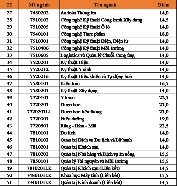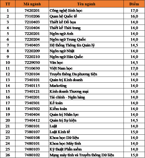 Theo đó, mức điểm chuẩn dao động từ 14 đến 22,5 điểm theo từng ngành. Cụ thể: