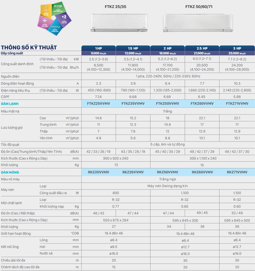 Công suất chi tiết cho dòng Máy lạnh treo tường DAIKIN model FTKZ lần lượt là 1HP-1.5HP-2HP-2.5HP-3HP kèm công nghệ Inverter tiết kiệm điện năng tối đa cho người dùng