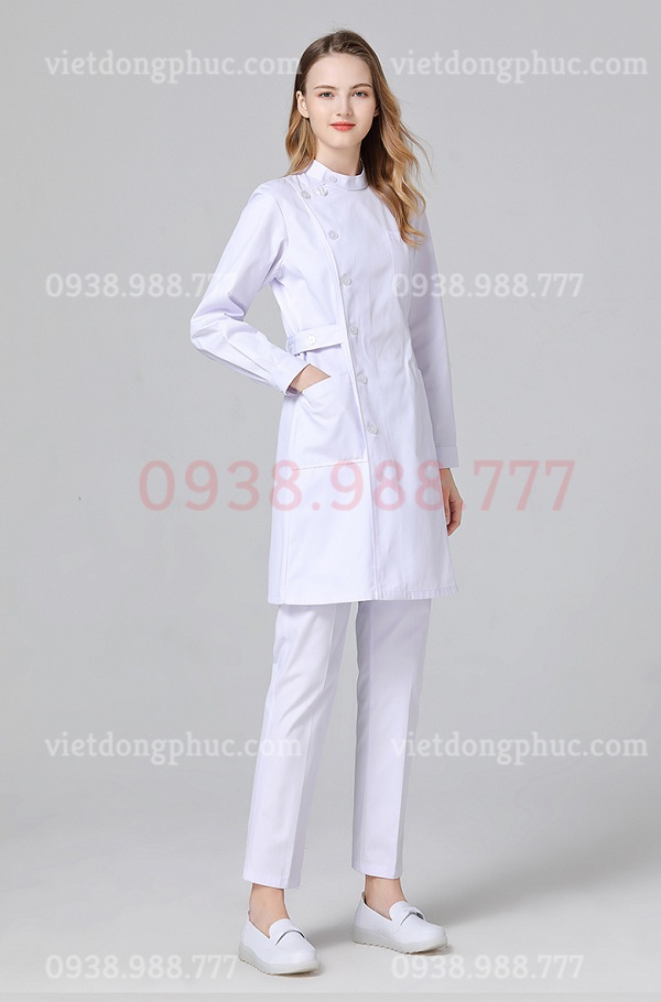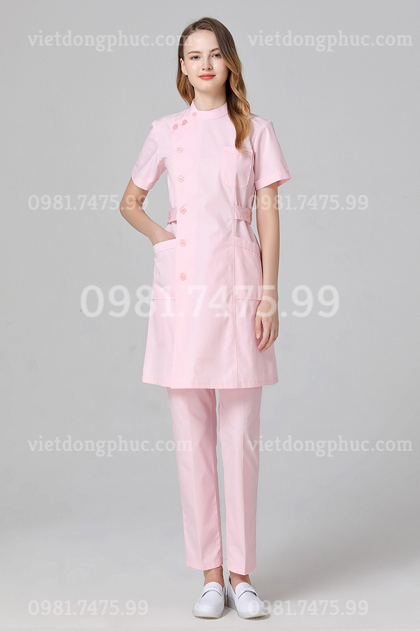 - Mẫu váy Y tá được may kiểu cổ tàu, form dáng chữ A hiện đại cùng độ dài qua gối thích hợp với nhiều vóc dáng khác nhau.