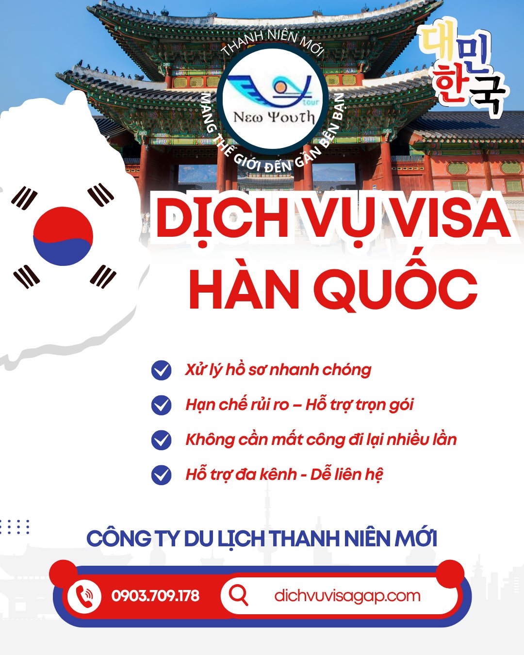 Bạn muốn đi du lịch Hàn Quốc? Bạn cần xin visa Hàn Quốc? Hãy liên hệ ngay đến dịch vụ làm visa Hàn Quốc của Công ty Thanh Niên Mới. Chúng tôi sẽ giúp bạn xin cấp visa Hàn Quốc nhanh từ 6-8 ngày có kết quả.