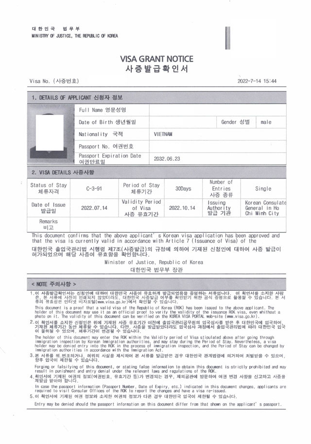 - Visa Hàn Quốc (Visa Grant Notice) còn hạn.