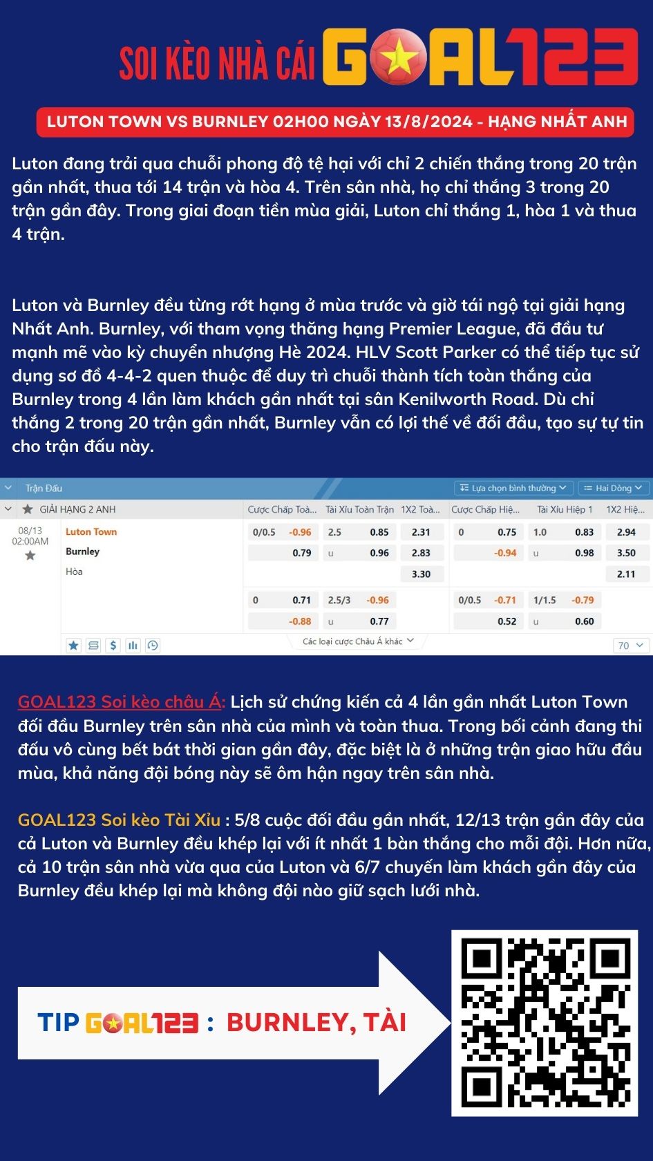 SOI KÈO NHÀ CÁI GOAL123 : Luton Town vs Burnley 02h00 ngày 13/8/2024 - Hạng Nhất Anh