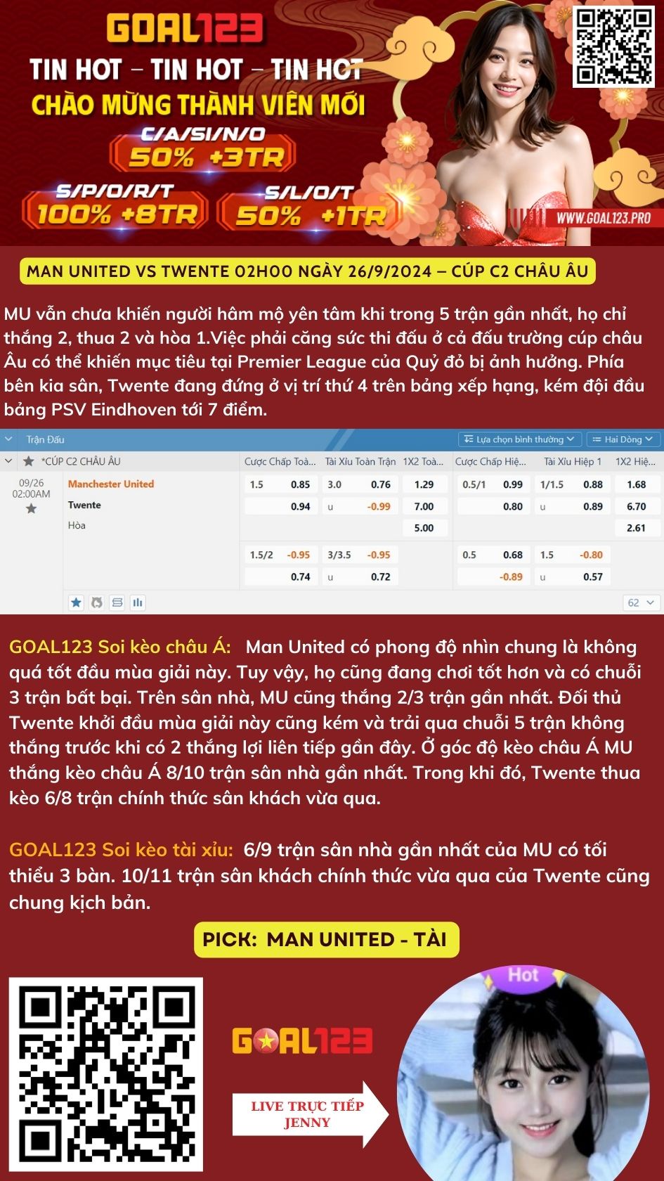 GOAL123 Soi kèo tài xỉu: 6/9 trận sân nhà gần nhất của MU có tối thiểu 3 bàn. 10/11 trận sân khách chính thức vừa qua của Twente cũng chung kịch bản.