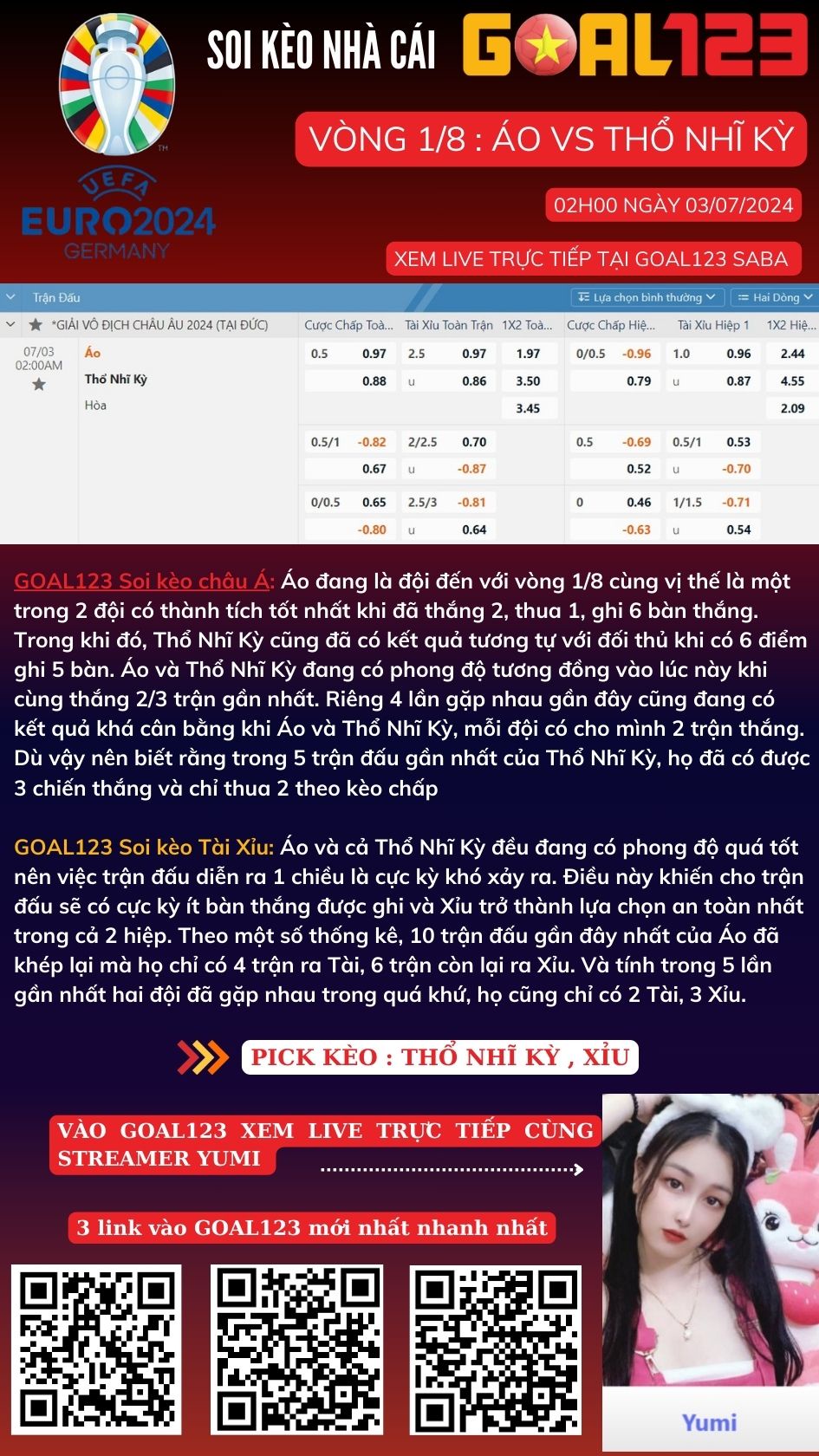 GOAL123 hân hạnh là nơi tin cậy để bạn đặt cược trận cầu hấp dẫn giữa Áo vs Thổ Nhĩ Kỳ – 02h00 ngày 03/07/2024 - Euro 2024 vòng 1/8 .Với sự uy tín và kinh nghiệm lâu năm, GOAL123 cam kết mang đến cho bạn một trải nghiệm đặt cược an toàn, hiệu quả và đầy hứng khởi khi trực tiếp xem trận đấu Live cùng Yumi. Hãy cùng chúng tôi hòa mình vào không khí sôi động của trận đấu đỉnh cao này, tận hưởng niềm vui chiến thắng cũng như cách quản lý tài chính hiệu quả để kỳ Euro của bạn thêm trọn vẹn và đáng nhớ!