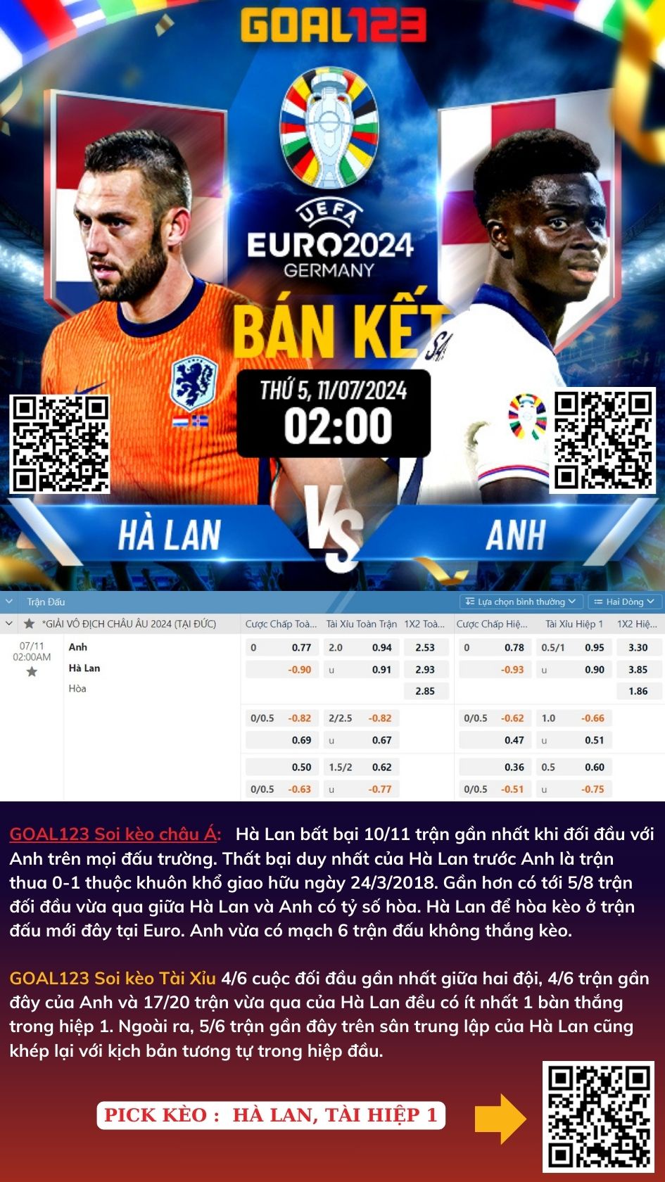 GOAL123 Soi kèo tài xỉu: 4/6 cuộc đối đầu gần nhất giữa hai đội, 4/6 trận gần đây của Anh và 17/20 trận vừa qua của Hà Lan đều có ít nhất 1 bàn thắng trong hiệp 1. Ngoài ra, 5/6 trận gần đây trên sân trung lập của Hà Lan cũng khép lại với kịch bản tương tự trong hiệp đầu.