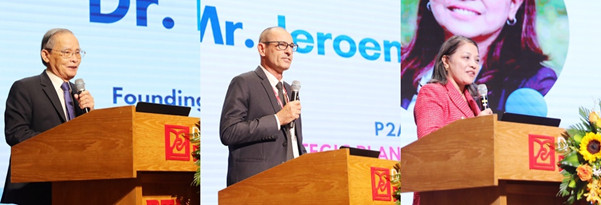 AHLĐ.NGƯT Lê Công Cơ - Chủ tịch Hội đồng trường ĐH Duy Tân, Việt Nam (ngoài cùng bên trái); ông Jeroen Schedler - Giám đốc Chiến lược & Phát triển P2A, ĐH Rangsit, Thái Lan; và TS. Ethel Agnes Pascua-Valenzuela - nguyên Giám đốc SEAMEO (Tổ chức các Bộ trưởng Giáo dục Đông Nam Á), cố vấn giáo dục cho Ban Giáo dục tương lai, Ban Thư ký ASEAN phát biểu tại hội nghị