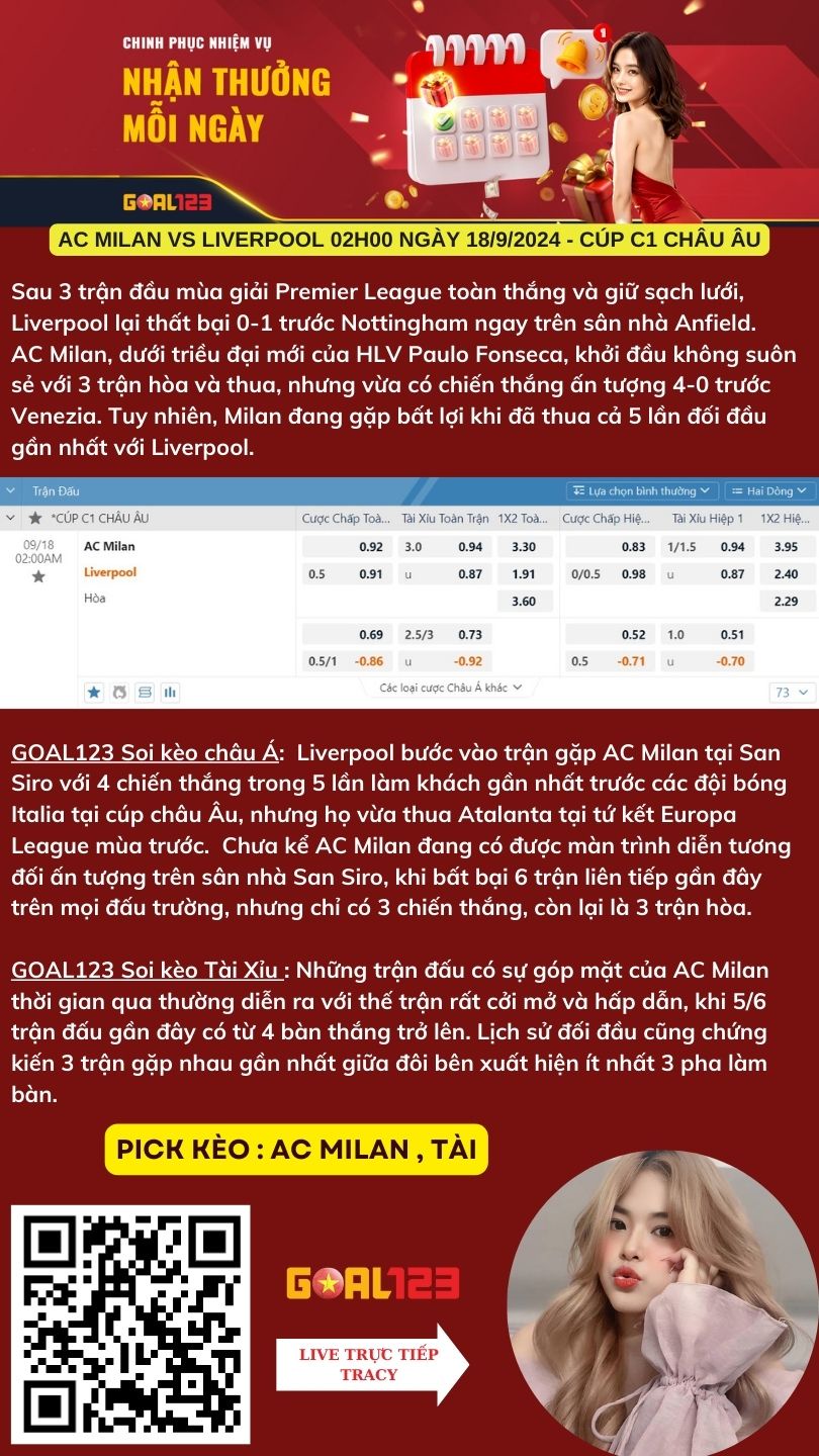 SOI KÈO NHÀ CÁI GOAL123 : AC Milan vs Liverpool 02h00 ngày 18/9/2024 - Cúp C1 châu Âu