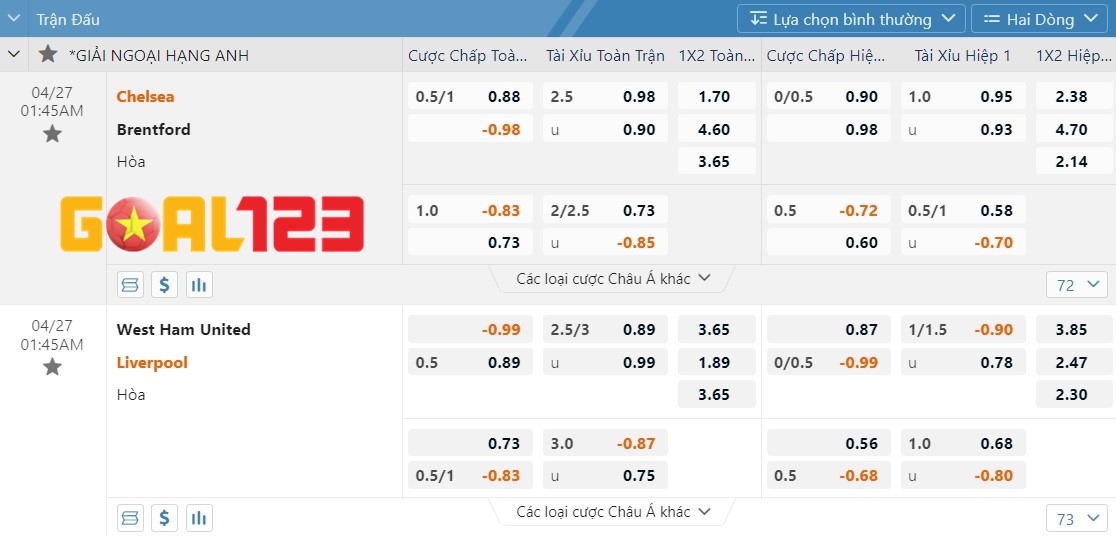 Đặt cược Goal123 thắng kèo Ngoại Hạng Anh : West Ham vs Liverpool, 01h45 ngày 27/4