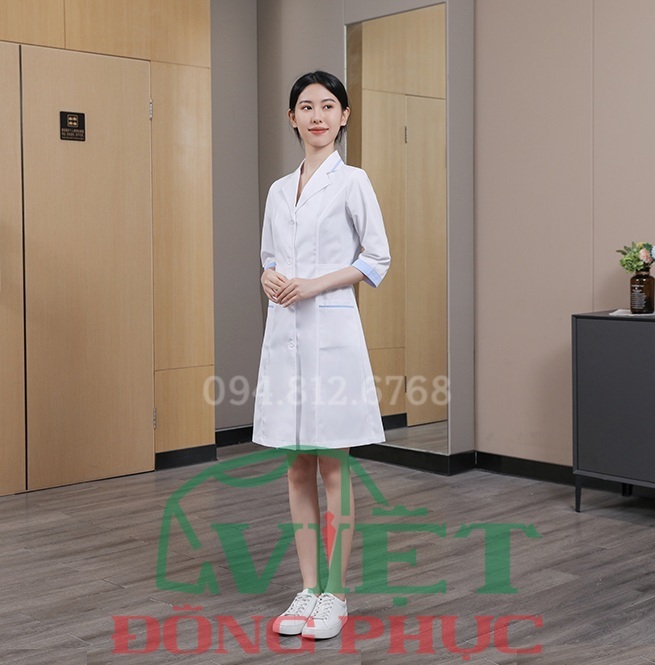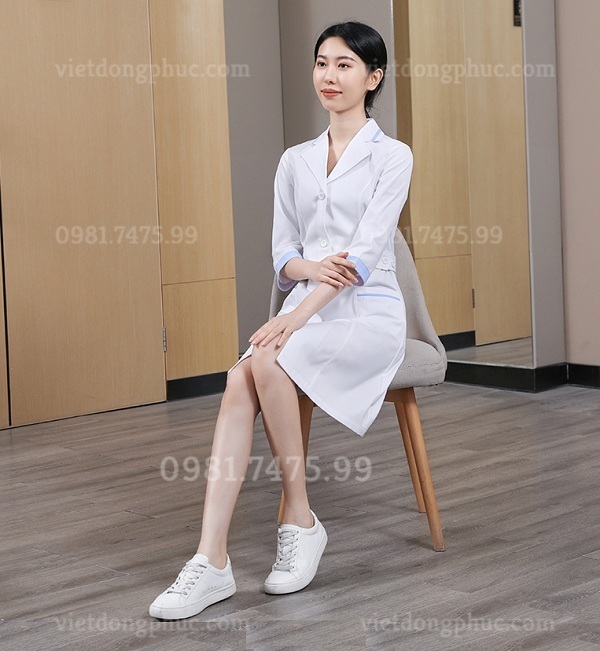 - Mẫu áo choàng bác sĩ mà VIỆT ĐỒNG PHỤC giới thiệu dưới đây với sắc trắng biểu trưng cho sự tinh khiết kết hợp cùng kiểu cổ bẻ chữ K phối viền màu sang trọng và thanh nhã.