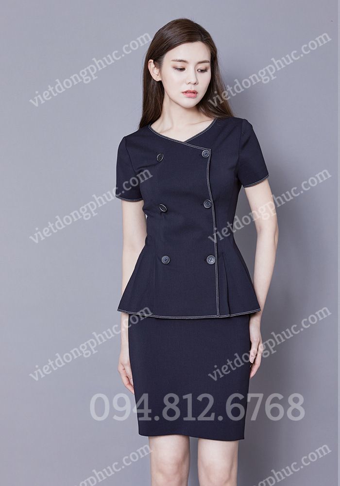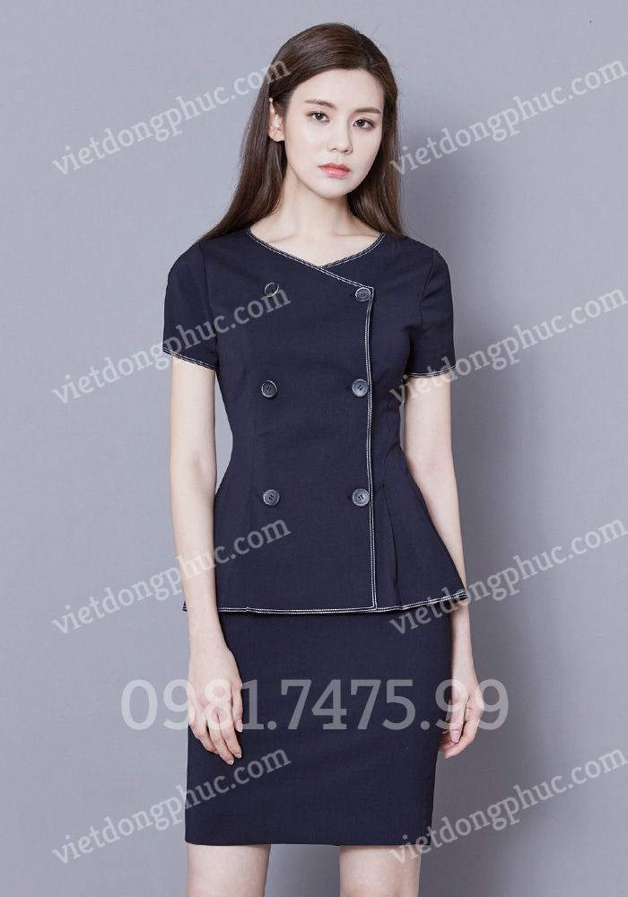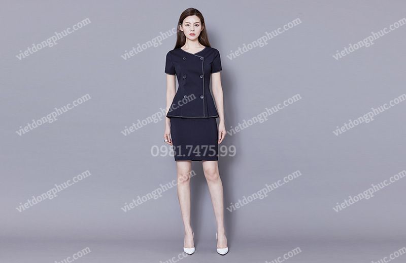 - Mẫu đồng phục Lễ tân mà VIỆT ĐỒNG PHỤC giới thiệu dưới đây được thiết kế nổi bật với kiểu cổ chữ V mới lạ, hàng khuy cúc bản to tinh tế, độc đáo.