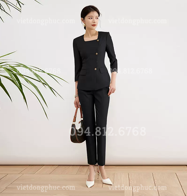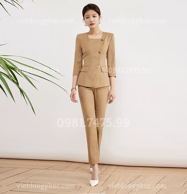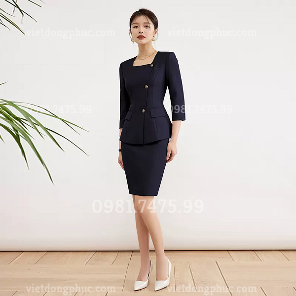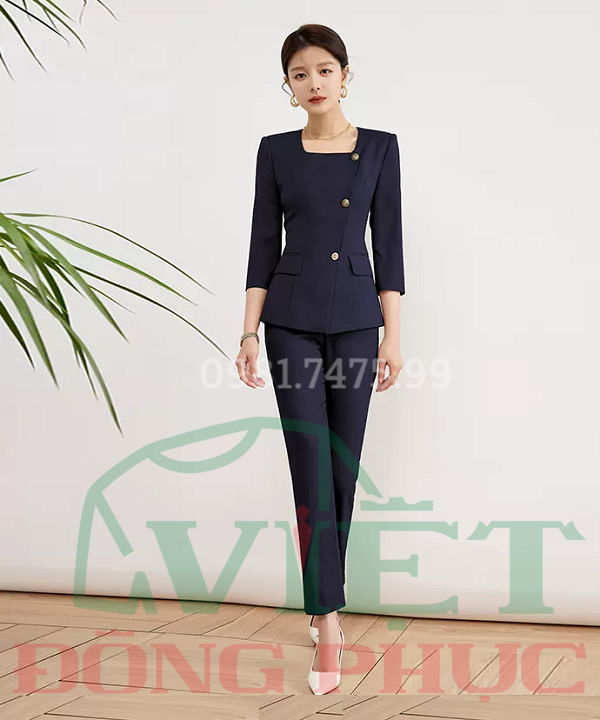 - Áo được may kiểu cổ vuông, thể hiện nét mạnh mẽ, phóng khoáng của phong cách thời trang hiện đại. Đường chiết ly gọn gàng, chuẩn xác tôn lên vóc dáng cân đối của người mặc.