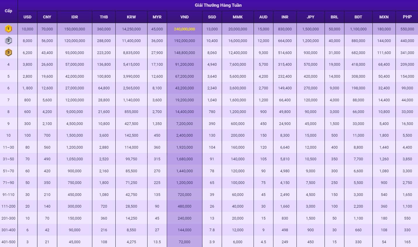 Nếu một người chơi xuất hiện trên nhiều bảng xếp hạng, người chơi đó sẽ có thể giành được nhiều giải thưởng. Phần thưởng sẽ được chuyển trong 72 giờ sau khi giải đấu kết thúc, vui lòng theo dõi số dư trong ví của bạn.