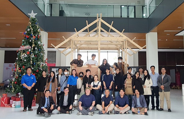 TS Trần Gia Việt Mỹ (thứ 2 từ phải qua hàng đầu), GS-KTS Bundit Kanisthakhon (thứ 3 từ phải qua hàng đầu) cùng các giảng viên và sinh viên ĐH Duy Tân bên một công trình tỷ lệ 1:1