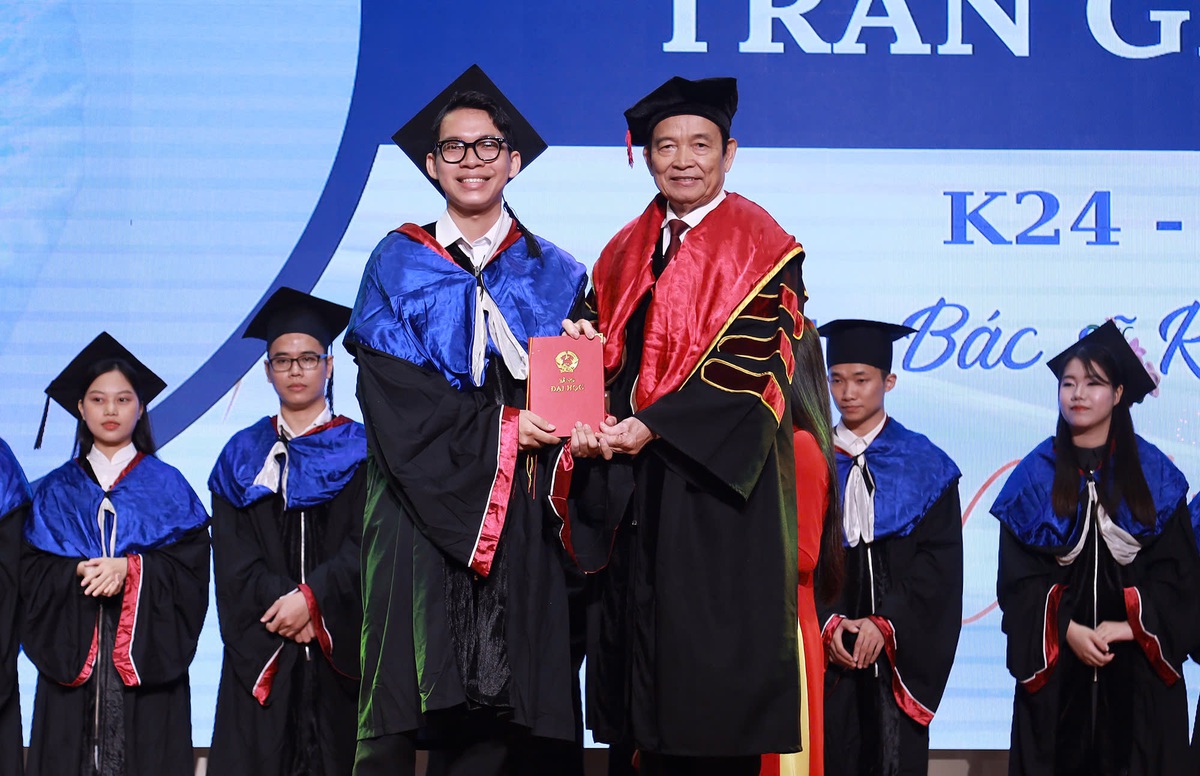 NGND.GS.TS.BS. Trần Hữu Dàng - phó hiệu trưởng ĐH Duy Tân, trao bằng tốt nghiệp cho Trần Gia Bảo - thủ khoa đầu ra ngành Bác sĩ Răng-Hàm-Mặt - Ảnh: ĐH Duy Tân