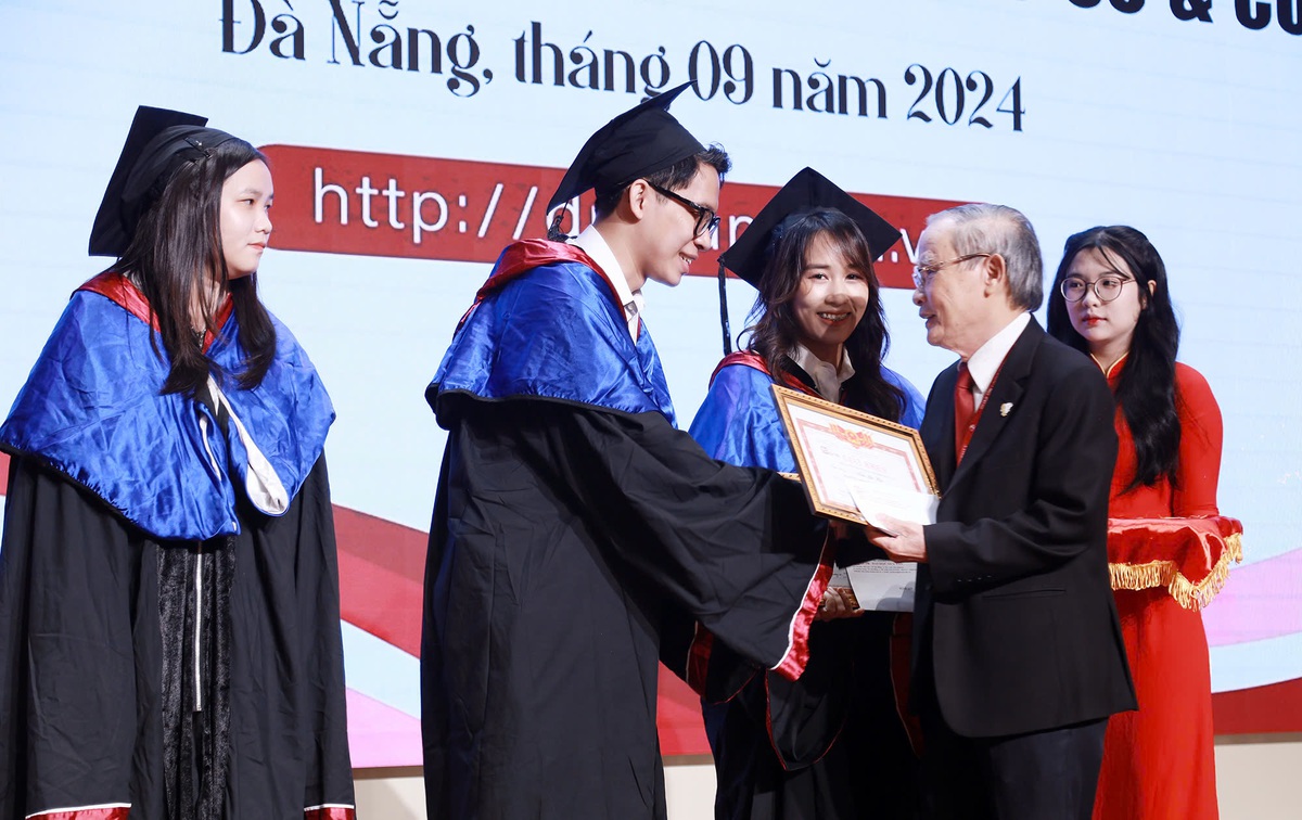 Anh hùng Lao động, NGƯT Lê Công Cơ - chủ tịch Hội đồng Trường DTU trao giấy khen cho các sinh viên tốt nghiệp xuất sắc - Ảnh: ĐH Duy Tân