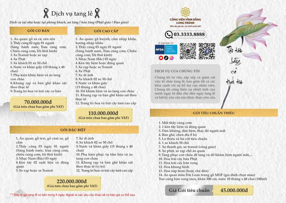 Khi lựa chọn dịch vụ TANG LỄ TRỌN GÓI Quý gia đình sẽ được thỏa thuận mức giá chung trong toàn quy trình tổ chức và KHÔNG LO PHÁT SINH CHI PHÍ. Vì chi phí trọn gói cũng dựa trên cơ sở chi phí của từng nghi lễ. Hơn nữa chi phí trọn gói cho dịch vụ tang lễ giúp tang chủ tiết kiệm hơn so với việc tổ chức riêng lẻ từng khâu.