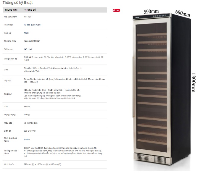 Sản phẩm Tủ ủ rượu vang Kadeka được bán tại Thiết bị nhà bếp nhập khẩu – Bếp Châu Anh – Số 4, ngõ 332/7 Hoàng Công Chất, P.Phú Diễn, Q.Bắc Từ Liêm, Hà Nội