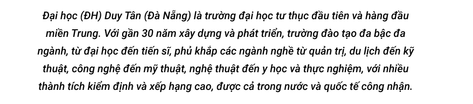Với nhiều thành tựu và tiêu chuẩn cao về cơ sở vật chất, chất lượng giáo dục, kiểm định và xếp hạng quốc tế, ĐH Duy Tân chắc chắn là sự lựa chọn đúng đắn cho bạn trong việc tìm kiếm "ngôi nhà mới" cho quãng đời học đại học của mình, xứng đáng là "Nguyện vọng 1" trong chọn lựa của các bạn…